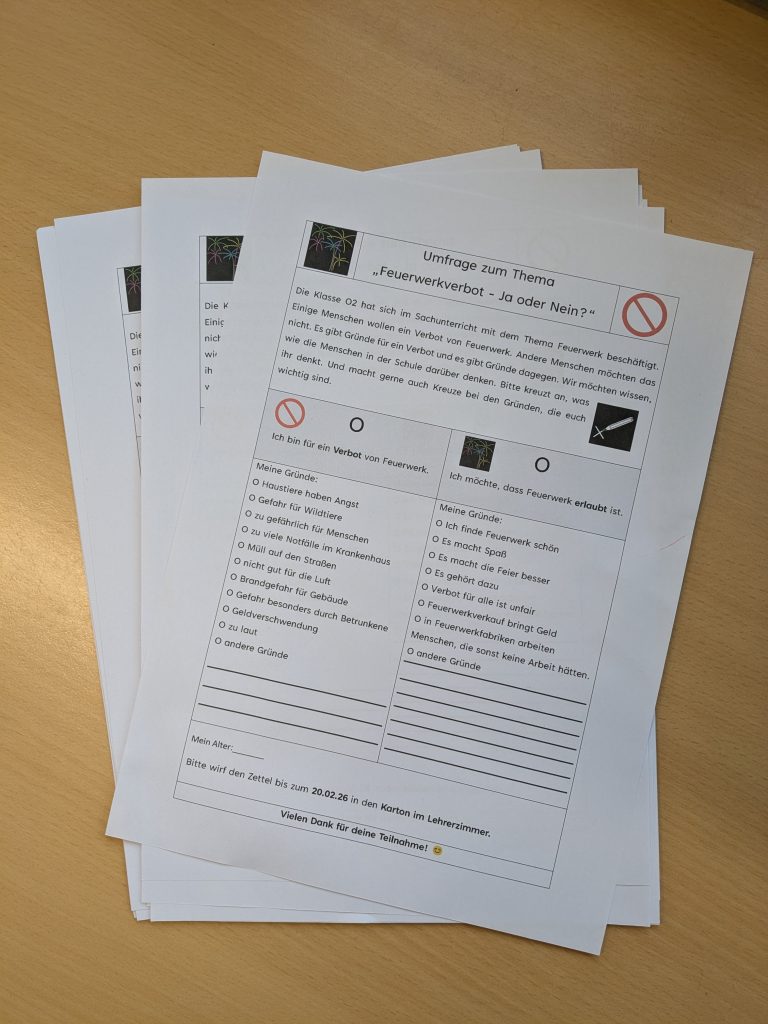 Wir möchten eine Umfrage zum Thema machen. Es wäre schön, wenn ganz viele Menschen an unserer Schule an der Umfrage teilnehmen. Dazu werden wir Umfragezettel verteilen. Auf den Zetteln kann jeder seine Meinung angeben. Für die ausgefüllten Zettel haben wir einen Karton im Lehrerzimmer aufgestellt. Wir sind schon sehr gespannt, was wir herausfinden.
